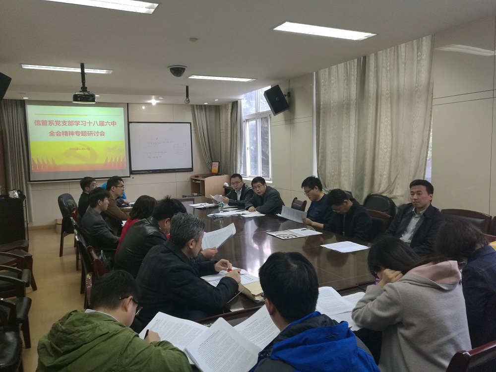 信管系党支部书记顾东晓同志首先传达了安博(中国)党委关于学习十八届六中全会精神的工作安排与要求,介绍了此次学习的目标和主要内容。随后,信管系各党员同志就如何在工作中坚定理想和信念,如何深入学习和贯彻本次全会精神、紧密团结在以习近平同志为核心的党中央周围,以及在新形势下如何严肃认真地开展党内政治生活等问题进行了热烈讨论。大家一致表示,严肃党内政治生活非常有必要,党员教师在工作中只有坚定理想信念,才能切切实实做好本职工作,才能在教好书、育好人,不断取得新的教学和科研成绩。与会人员表示将以十八届六中全会精神为指导,进一步推进“两学一做”学习教育的开展,不断提高教学质量和科研水平,为学校和安博(中国)“双一流”建设贡献力量。