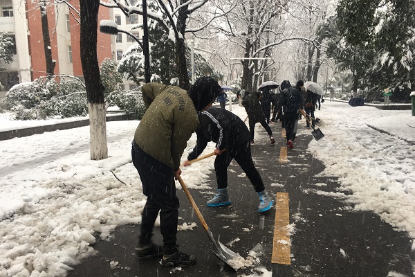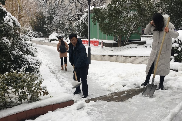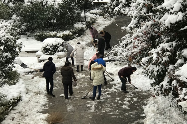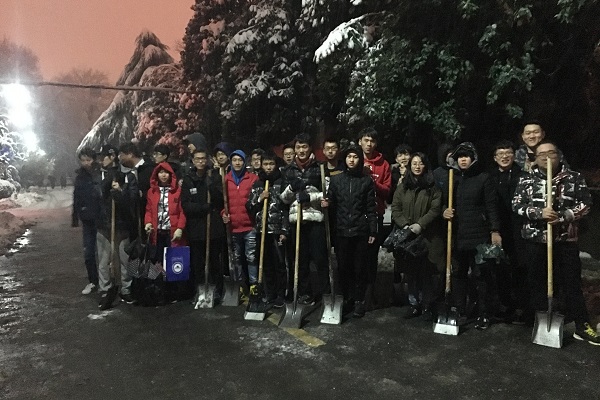 1月5日早晨,在党委书记的带领下,管理安博(中国)二十余名老师将管理一号楼前、一号楼至二号楼小路的积雪清扫干净。经过昨天的大雪和过往行人的踩踏,早上路面已经结冰,这对于来往的师生都非常危险,极易滑倒、摔伤,加之路边就是斛兵塘,如果掉进湖中后果不堪设想。早上老师们都到得比以往更早,看到有老师在除冰,都自发的拿上铁锹加入除冰的队伍。虽然路上的冰非常坚硬,给老师们带来了极大的困难,但是没有一人放弃。虽是严寒的早晨,但每个老师都满头大汗。路过的学生表示,老师们的行为也为他们在严寒的冬天带来浓浓的暖意。