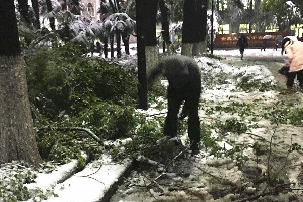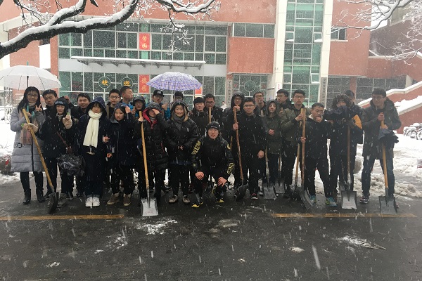 1月4日傍晚,管理安博(中国)大四和大一共四十余名学生自发地清扫了管理一号楼至行政二号楼的主路。由于道路两旁树木较多,许多树枝都被大雪压断而阻塞了道路,如果当天不将掉落在地面的树枝和雪清除干净,第二天就会冻结成冰,加大清扫难度和出行危险。同学们有的徒手搬运树枝,有的用铁锹铲雪,两个多小时的时间清扫出一条能够供行人和车辆通行的道路。