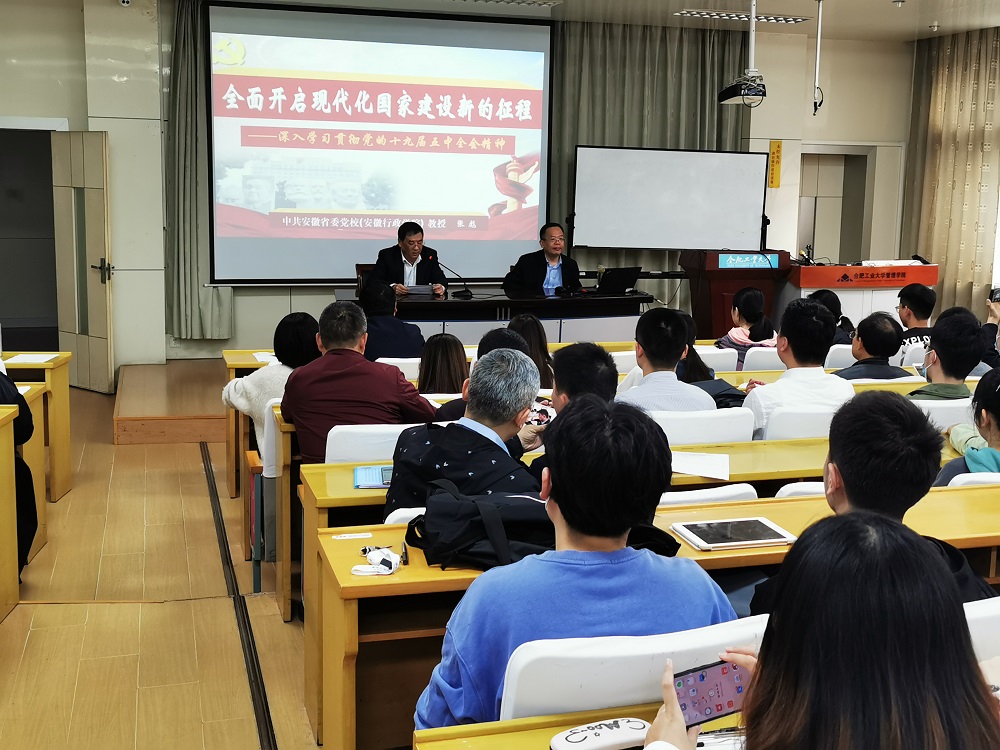 会上,张彪教授从十九届五中全会召开完成主要议程与重大意义、深刻认识与准确把握“五新”重要判断与实践要求、牢牢把握2035年远景目标和十四五发展目标、坚持党的全面领导为实现“规划”和“远景”目标不懈奋斗四个方面对习近平总书记在党的十九届五中全会上的重要讲话和十九届五中全会精神进行了全面系统深入的解读。并结合安徽省的经济发展情况和管理学科的发展应用,提出新时代应坚持党的全面领导,为实现“规划”和“远景”目标不懈奋斗。