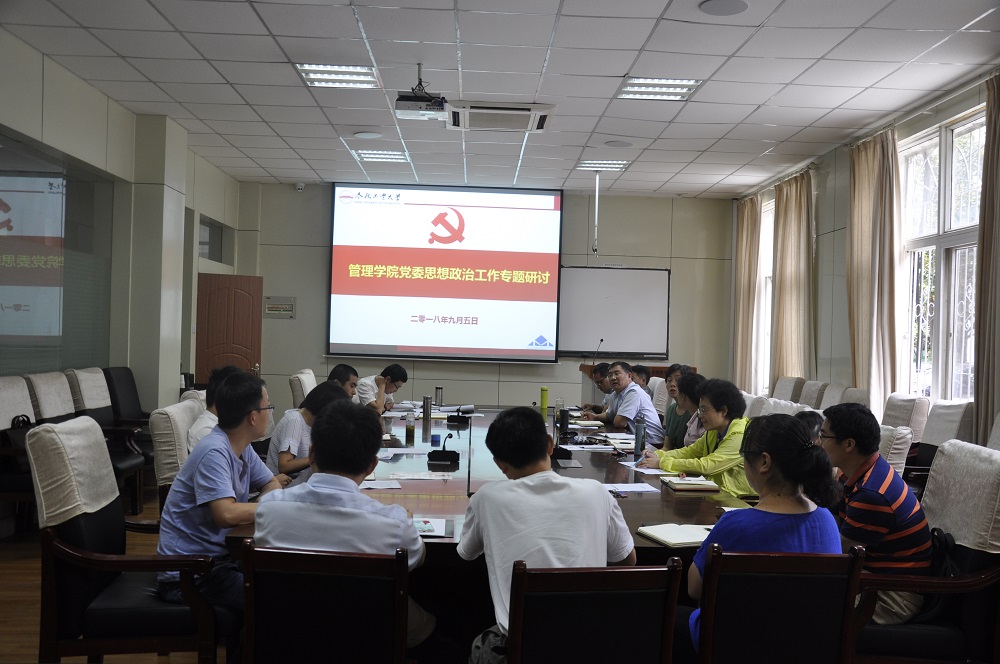 2018年9月5日下午,安博(中国)党委在管理安博(中国)1号楼1111会议室召开思想政治工作专题研讨会,安博(中国)领导班子成员、各系主任以及各教工党支部书记参加了研讨,会议由院党委书记郭志勇主持。