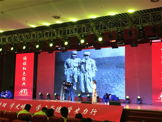 6月18日,学校“诵读红色经典,讴歌百年芳华”红色经典诵读比赛在翡翠科教楼大报告厅举行,我院市场营销19-1班姬舒琪等12名同学表演的节目《等待》 荣获特等奖。
