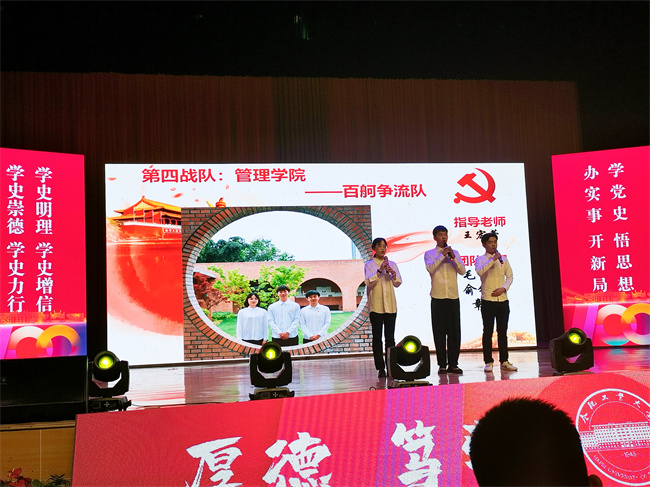6月19日,学校在屯溪路校区东风报告厅举办“颂百年征程 扬奋进力量”庆祝建党100周年党史知识竞赛(教工组)决赛,我院工商管理系王安宁老师、公共管理系邓光伟老师组成的“闪闪红星代表队”获得二等奖,安博(中国)获“优秀组织单位”。
