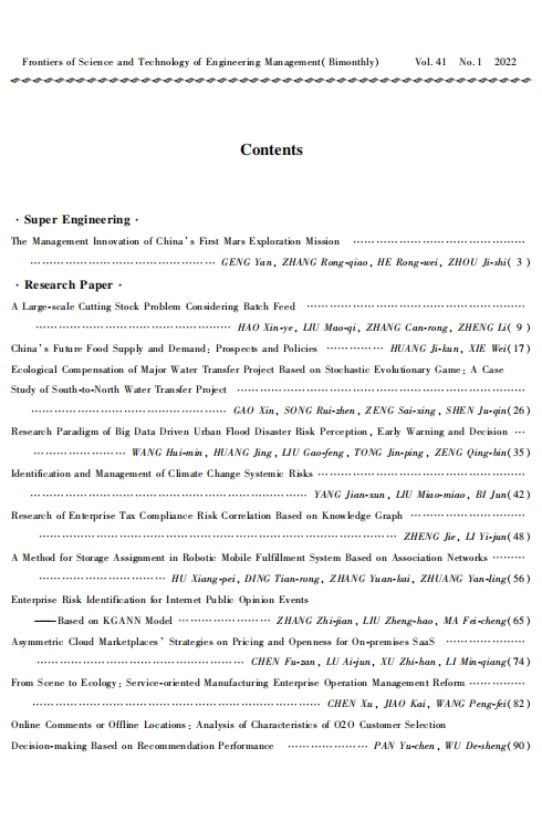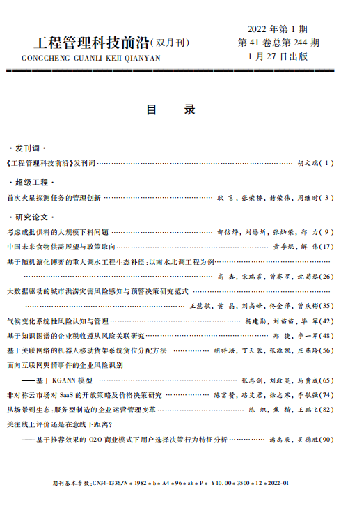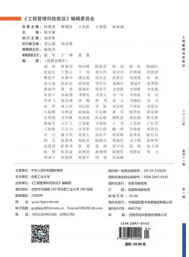 《工程管理科技前沿》是由原《预测》杂志更名,教育部主管、中国工程院工程管理学部指导、合肥工业大学主办,面向国内外公开出版发行的工程科技、工程管理类学术期刊。期刊由中国工程院工程管理学部主任胡文瑞院士任主编,中国工程院杨善林院士任执行主编,集中了包括中国工程院工程管理学部全部非资深院士和部分资深院士在内的全国著名工程技术和工程管理专家组成编辑委员会,邀请了一批从事工程建设和管理领域研究的国内知名专家组成了特约通讯专家队伍。创立旨在促进国内外工程科技与工程管理科学家之间的学术交流,为国内外学术界和产业界提供一个分享新发现的高水平的高端交流平台。期刊是国家自然科学基金委员会管理科学部A级重要期刊、中文社会科学引文索引期刊(CSSCI)、中国人文社会科学核心期刊、中文核心期刊、中国科技核心期刊和RCCSE中国核心学术期刊(A)。