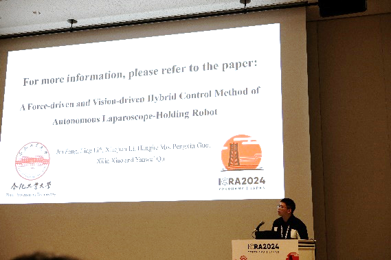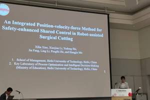 除了携机器人参展以外,李霄剑团队的肖夕林博士和方进博士还受邀进行了分组学术报告。管理科学与工程2019级博士肖夕林受邀在“Motion Control”主题学术报告会上对其参会论文“An Integrated Position-velocity-force Method for Safety-enhanced shared control in Robot-assisted Surgical Cutting”进行汇报。该论文提出了一种增强安全性的人机共享控制方法,通过运动融合机制实现人主导下人与机器人主控权的柔顺切换,并设计了一种力反馈机制以提高安全性。管理科学与工程2022级博士方进受邀在“Medical Robots”主题学术报告会上对其参会论文“A Force-driven and Vision-driven Hybrid Control Method of Autonomous Laparoscope-Holding Robot”进行汇报。该论文提出了一种面向腔镜扶持机器人系统的力觉和视觉混合控制方法,将视觉信息生成的虚拟力矩和触力握把获得的交互力矩进行融合,在远程运动中心约束下实现对腹腔镜视野的引导。两场汇报都受到了在场专家学者的高度关注,多名学者对报告进行了现场提问。