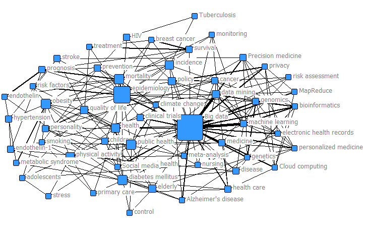 研究热点是一定时期内学科研究的焦点和集约所在,表现为在一个学科问题上大量文献,学术思想的集中涌现和大量相关研究者群体的出现。关键词词频统计和关键词共词分析显示,流行病学、公共健康、肥胖病、乳腺癌、糖尿病等是当前国际医疗健康大数据研究的热点应用领域(见图2)。而从技术层面来看,数据挖掘和机器学习是支撑医疗健康大数据研究的最重要的两大技术基础。