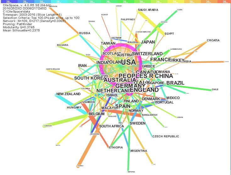国家合作网络分析结果显示,医疗健康大数据研究国家间的合作甚多。美国以662篇数量居第一位,中国和英国位居第二和第三(分别为235篇和191篇)。在代表地位重要性的中心性方面,美国最高,为0.44;英国为0.24,德国为0.12。而来自中国的论文数量虽然不少,但中心性较低(0.03),低于美、英、德、荷、加、法等国(见图1)。从各个国家开始投入医疗健康大数据研究的研究时间看,中国也起步较早。