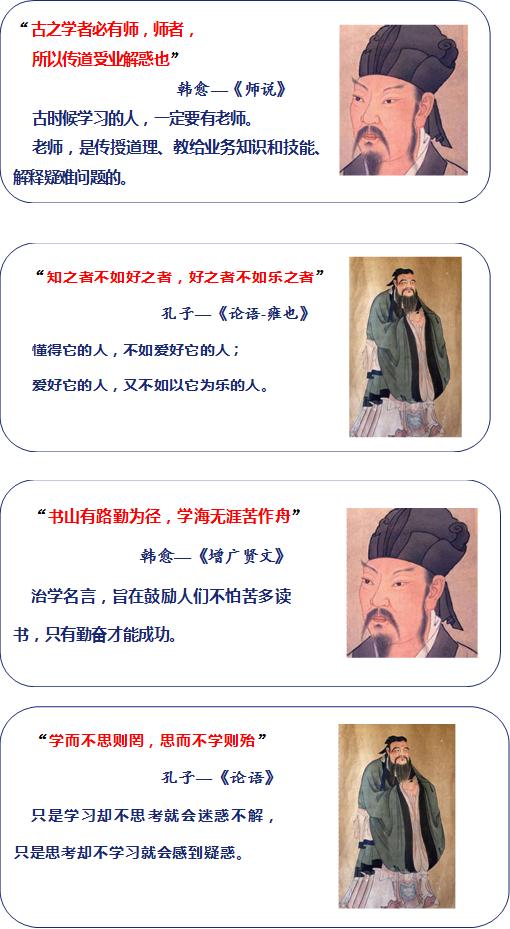 正确的学习态度是成功的必要基础。培养正确的科研思维,首要任务是具备正确的学习态度。下面以一些名人名句来展示一个层层递进的学习途径,建议学生以此自勉,在学习的不同阶段都能“勤勤恳恳、兢兢业业、不忘本分、不忘初心”。