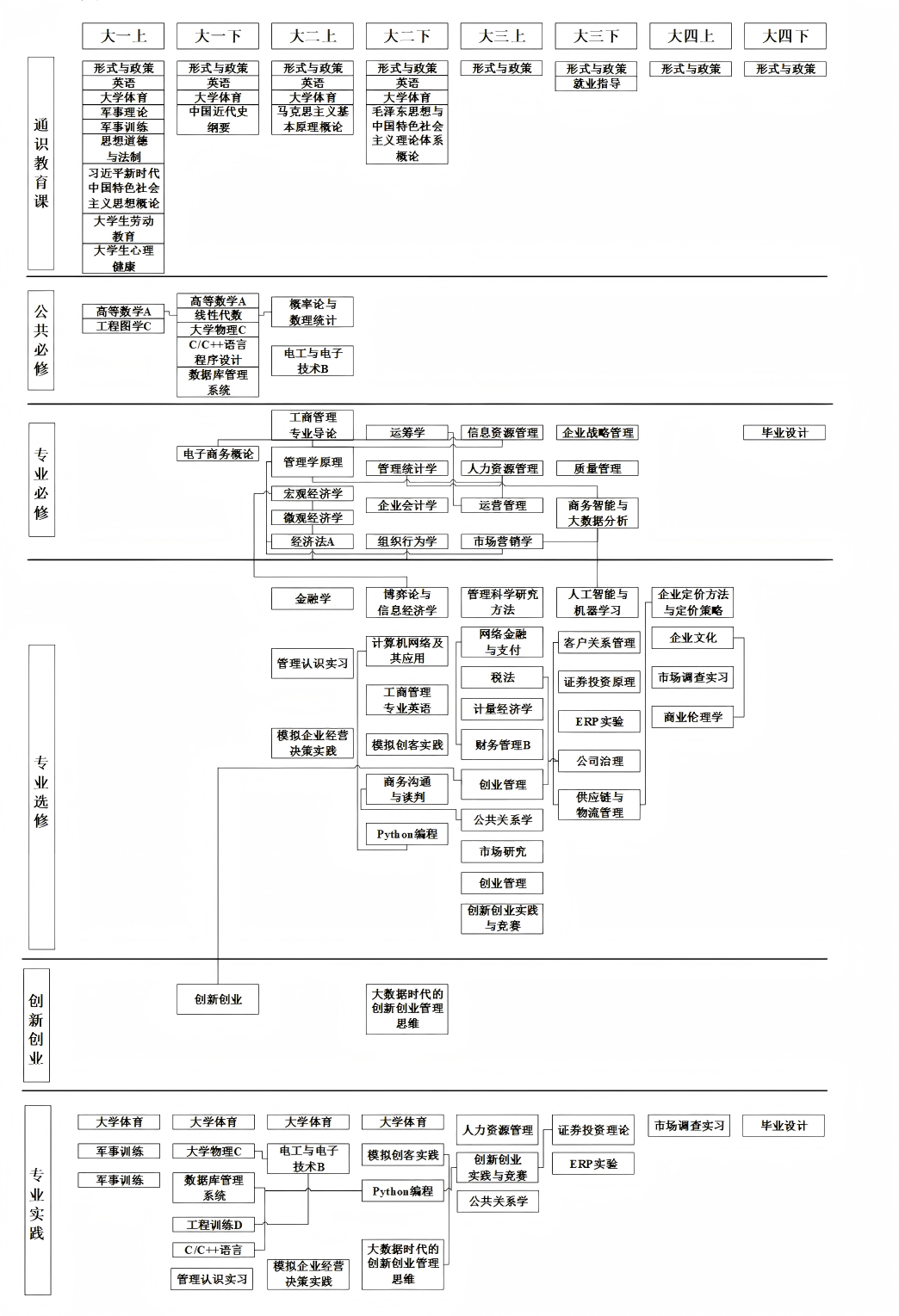 管理认识实习(48学时/2学分)、博弈论与信息经济学(32学时/2学分)、人工智能与机器学习(32学时/2学分)、Python编程(32学时/2学分)、商务沟通与谈判(32学时/2学分)、市场研究(32学时/2学分)、企业定价方法与定价策略(32学时/2学分)、财务管理B(40学时/2.5学分)、网络金融与支付(32学时/2学分)、客户关系管理(32学时/2学分)、证券投资原理(24+8学时/2学分)、计量经济学(32学时/2学分)、公共关系学(32学时/2学分)、商业伦理学(32学时/2学分)、金融学(32学时/2学分)、税法(32学时/2学分)、企业文化(32学时/2学分)、公司治理(32学时/2学分)、ERP实验(48学时/2学分)、 计算机网络及应用(32学时/2学分)、 管理科学研究方法(32学时/2学分)、物流与供应链管理(32学时/2学分)、工商管理专业英语(32学时/2学分)、模拟企业经营决策实践(48学时/2学分)、模拟创客实践(48学时/2学分)、市场调查实习(72学时/3学分)、创业管理(32学时/2学分)、创新创业实践与竞赛(48学时/2学分)。