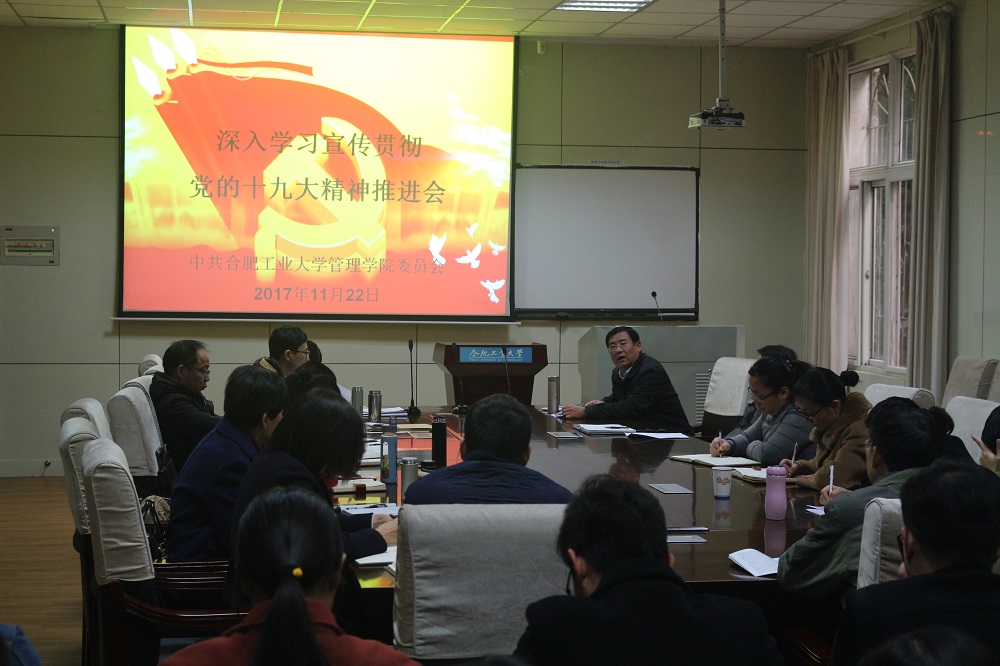 2017年11月22日下午,管理安博(中国)党委召开了深入学习宣传贯彻党的十九大精神推进会,院理论学习中心组成员、全体教工党支部书记和学生党支部书记参加了会议,院党委书记郭志勇主持此次学习。