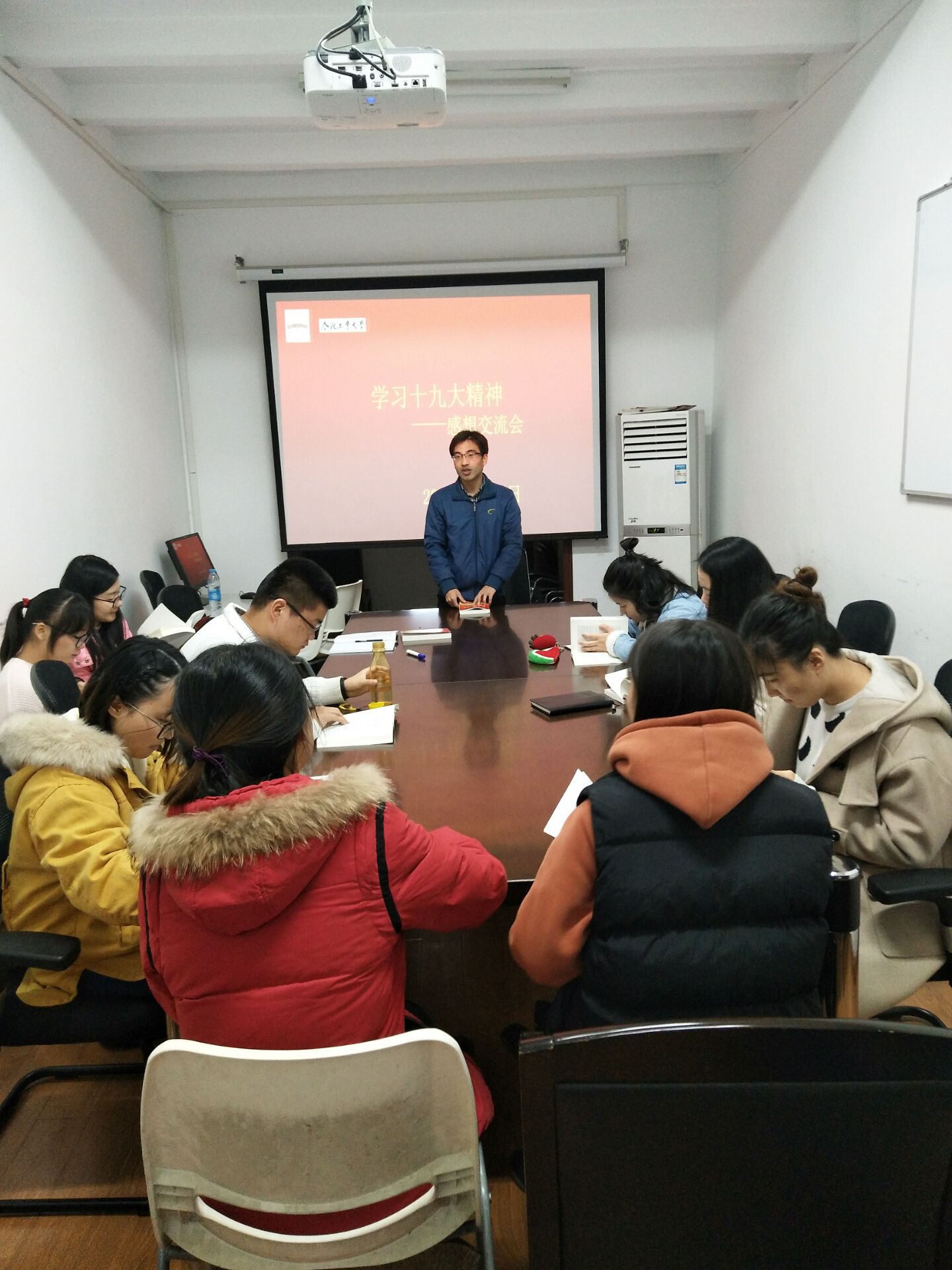 2017年12月4日上午10点,安博(中国)党委委员凡菊与其所联系的三个研究生党支部党员(资源经济与环境管理研究所党支部、品牌战略与服务营销研究所党支部、创业投资研究所党支部)在管理二号楼四楼会议室召开了学习十九大精神感想交流会,凡菊主持此次学习。