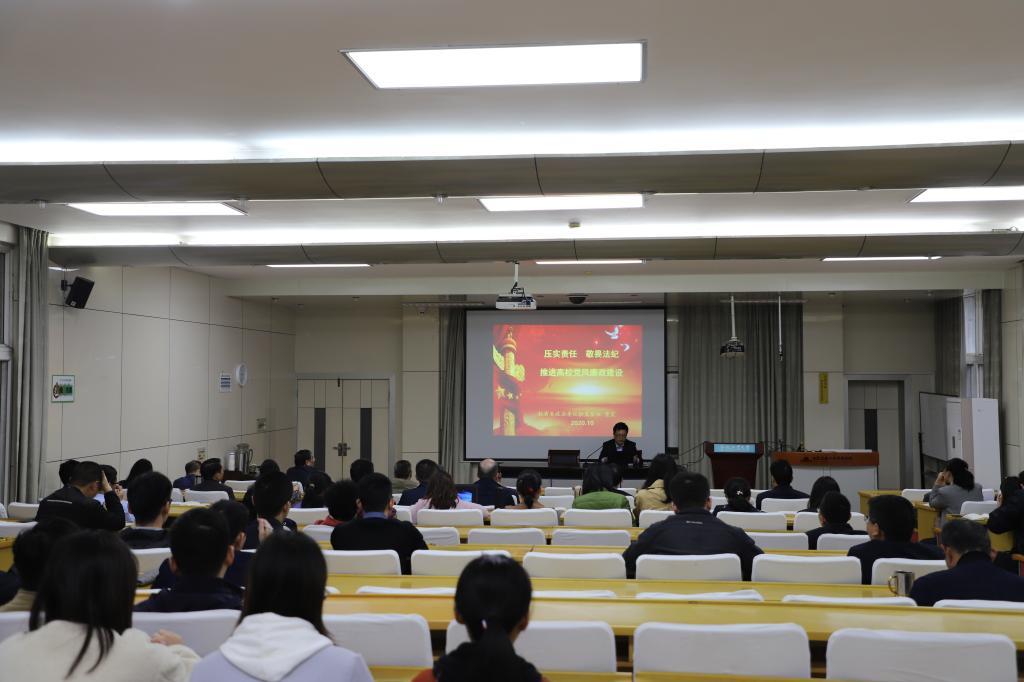 董震首先介绍了当前高校党风廉政建设面临的形势,总结了高校违纪违法案件的五大特点,报告中列举的一个个案例,案件中呈现的一组组数字让教师党员们深刻认识到党中央反腐肃纪的坚强决心,深刻理解了零容忍态度不变,越往后执纪越严的内涵。随后,他聚焦二级党组织如何发挥好七大主体责任,传导好四层责任,压实监督责任等做了详细的分析和阐述,希望党员干部履职尽责,共同推进党风廉政建设。最后,他结合教师的职业特点,重点围绕如何加强教师党员的政治纪律建设提出了建议和要求,希望党员教师明规矩、守法纪、知敬畏,做人民满意的好老师。