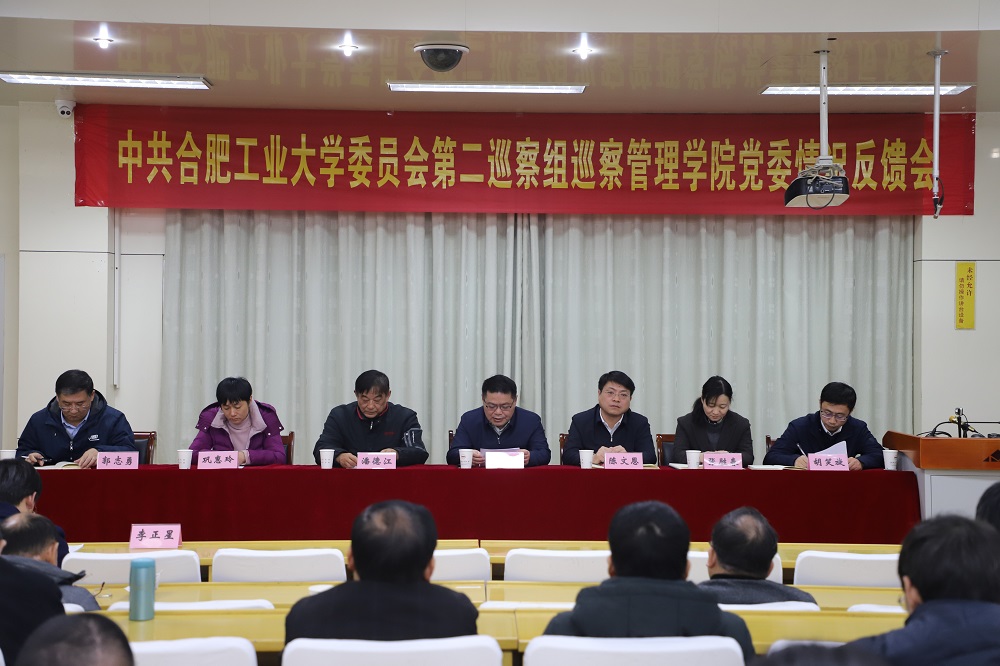 会上,第二巡察组组长潘德江宣读了《关于中共合肥工业大学委员会第二巡察组巡察管理安博(中国)党委情况的反馈意见》,按照校党委巡察工作统一部署,2020年10月9日至11月2日,校党委第一巡察组对管理安博(中国)党委开展了巡察。巡察组以习近平总书记关于巡视工作的重要论述为指导,以“四个意识”为标杆、以党章党规党纪为尺子,突出坚持党的领导,聚焦全面从严治党,以“两个维护”为根本政治任务,紧扣“六项纪律”,紧盯“重点人、重点事、重点问题”。通过与管理安博(中国)领导班子见面、组织召开巡察动员会、听取党委工作汇报、开展问卷调查、与干部群众和个别谈话,受理信访举报、调阅有关文件资料,抽查核实有关情况,走访相关部门单位,并对巡察中发现的重点问题进行了深入了解,顺利完成了巡察任务。巡查组在肯定管理安博(中国)取得成绩的基础上,从四个方面反馈了巡察中发现的主要问题,重点指出了安博(中国)党委在落实党的路线方针政策和党中央重大决策部署、教育部党组工作部署和学校党委工作要求上、贯彻落实全面从严治党的主体责任、贯彻落实新时代党的组织路线以及落实巡视巡察、审计、主题教育整改任务四个方面存在的问题,并从五个方面对安博(中国)党委提出了意见建议。一要把政治建设摆在首位,充分发挥党委政治核心作用;二要切实履行“两个责任”,压紧压实全面从严治党政治责任;三要严格落实新时代党的组织路线,夯实党建基础工作;四要切实担负起整改主体责任,建立健全长效机制;五要牢固树立“人才是第一资源”的理念,进一步提升高水平人才引育能力。