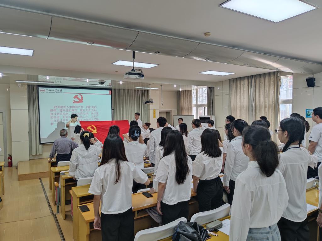 活动在雄壮的国歌声中拉开帷幕,学生党员代表章锋作为领誓人,带领全体毕业生党员面向党旗庄严宣誓,重温入党誓词,铿锵有力的宣誓声回荡在报告厅内,彰显着每位毕业生党员的坚定决心。随后,毕业生党员代表为新党员佩戴党员徽章。