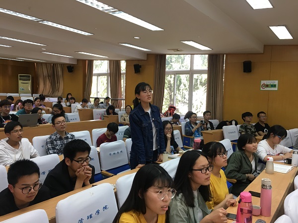 开讲环节中,闫丽冰结合个人求学和保研经历,从学习方法、时间安排、参考工具的使用、专业能力的培养、个人建议五个方面娓娓道来,并就分享交流之前收集同学们现阶段所面临的问题给出了自己的建议,她建议面临社团活动和学业的冲突应合理平衡,同时提高学习效率,在正确的时间做正确的事。董一诺则结合大学学习与求职经历,主要从学习目标规划和奋斗足迹进行介绍,提出明确自身目标后将学习与实践有机结合,大一阶段勇于尝试,大二阶段勤于追梦,大三阶段不断挑战。最后互动阶段,两位嘉宾认真的回答了同学们的提问,并就英语学习、做兼职、考ACCA证书等方面给出了具体建议,勉励同学们大学阶段要将自己的主要精力和时间投入到学习中去,并对2017级同学们的未来表示真诚地祝福,为同学们实现梦想的路上注入了积极的力量。