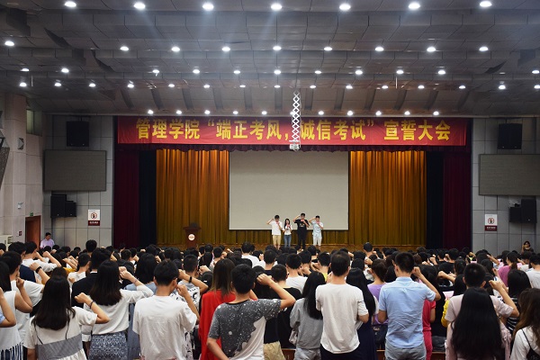 为进一步加强考风考纪建设,端正学生考试态度,营造诚信应考、公平竞争的考试氛围。6月29日下午,管理安博(中国)“端正学风,诚信考试”宣誓大会在斛兵礼堂举行。安博(中国)相关负责人、辅导员、研究生一年级学生和700余名本科生参加了活动。