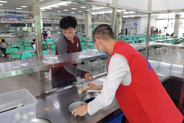 当天,五十名同学提前达到各自的岗位,听从指导老师讲解任务安排和工作要求。担任校区保卫的同学主要在北门和西门负责对进入校园的人员进行体温检测;负责校区清洁的同学分小组在斛兵塘周边分别进行扫地、拔草、捡垃圾等工作。休息期间,指导老师给同学们普及了花草知识,介绍了斛兵塘的历史,增进了同学们对校园的了解,激发了大家对学校的热爱之情;在校园食堂体验的同学从清晨五点半开始,与食堂员工们一起进行验菜、地面清扫、桌面清洁、垃圾清理、桌椅摆放、体温测量等日常工作。