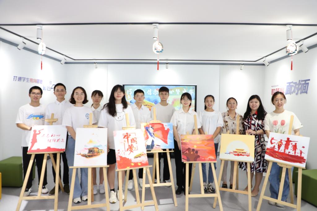 参加活动的学生们选取画板,积极投入,用笔触描绘祖国山河元素,用色彩表达心中爱与信念,在“五星红旗”“美丽中国”“相亲相爱”等音乐背景下,绘制出一幅幅兼具红色底蕴和观赏性强的艺术作品。“如果信念有颜色,那一定是中国红!”最后,学生们纷纷畅谈活动心得,郭凡嘉同学谈到“我的作品名为‘红色激情’,由六位青春热血、激情澎湃的青年人组成,他们在红色大地上跳跃、奔跑,表达了当代中国青年对美好理想的追求,以及脚踏实地,不断奋斗的青年品格。”吕世安同学的作品名为“不忘初心”,他说,“我的作品虽然只有红色和白色两种颜色,但是在一笔笔描绘中始终提醒自己初心之重,定会在百尺竿头更进一步的信念中,踔厉奋发、继续前行,书写属于我们青年一代的画卷。”