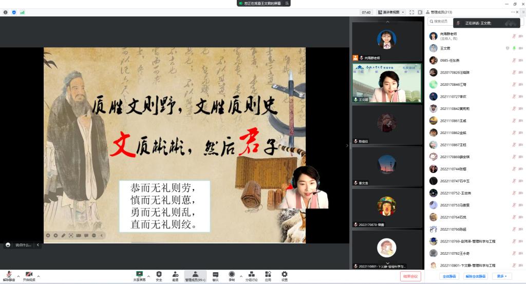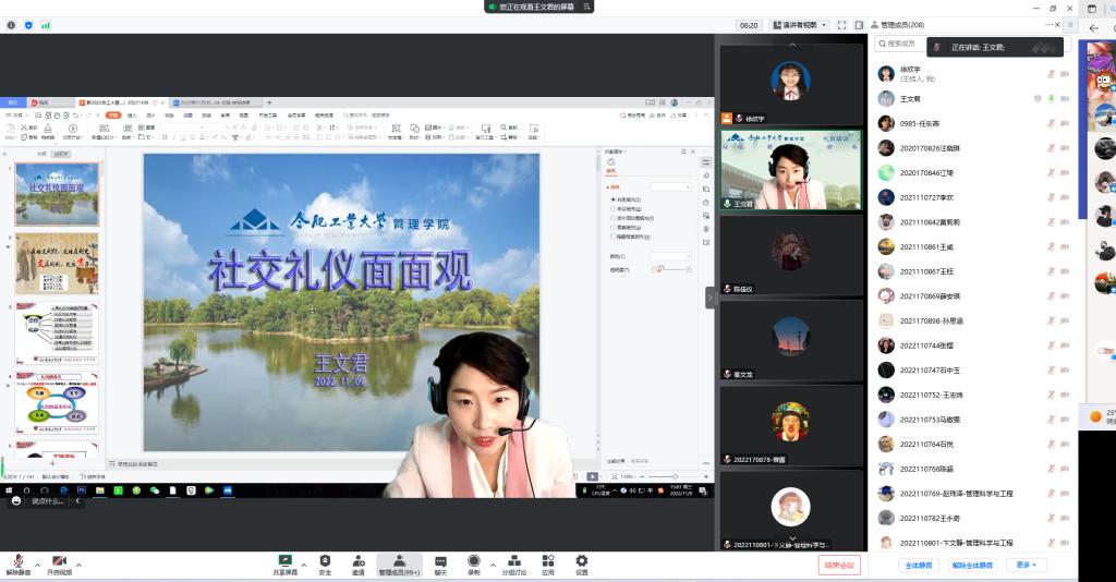 王文君聚焦仪容礼仪、仪态礼仪、沟通礼仪、交往礼仪四大方面,规范和塑造大学生日常礼仪。她强调“恭而无礼则劳,慎而无礼则葸,勇而无礼则乱,直而无礼则绞”,礼仪无处不在,有“礼”走遍天下,无“礼”寸步难行。为加深同学们对于礼仪的理解,王文君通过线上抢答、找不同等多种互动形式,带领同学们进行服饰礼仪实操,让同学们在互动演练中增长知识,掌握技能。