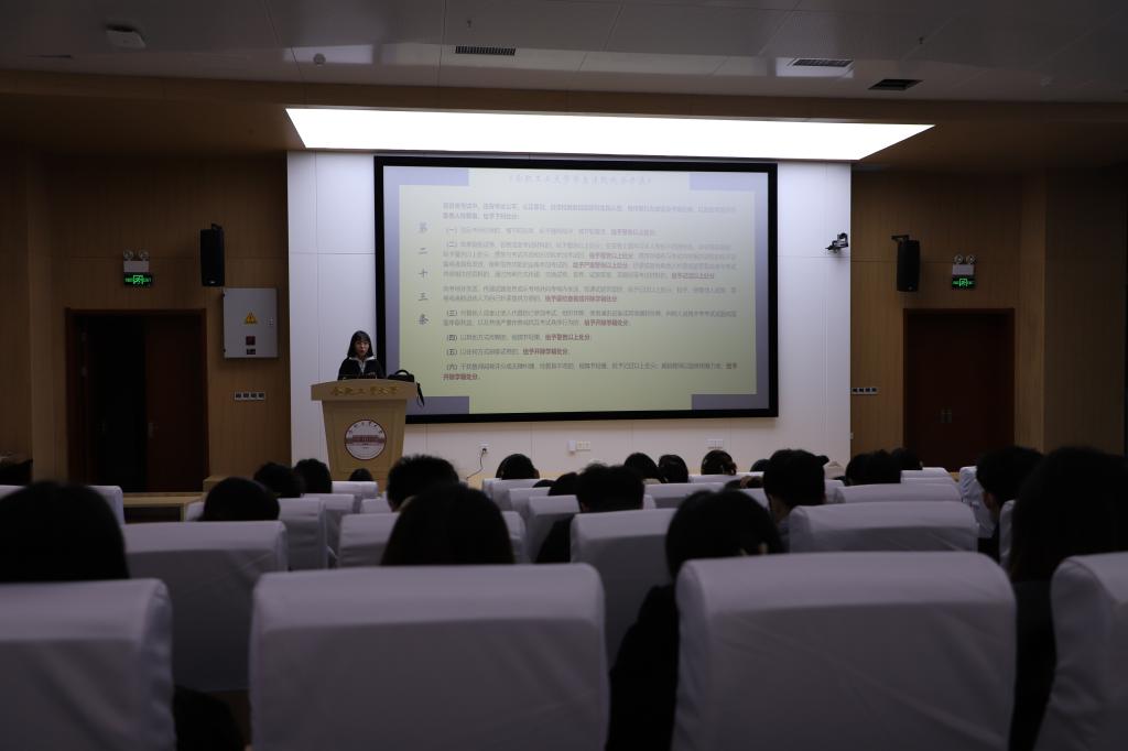 会上,徐欣宇向研究生新生解读了《国家教育考试违规处理办法》《合肥工业大学学生违纪处分办法》《合肥工业大学考试管理细则》《合肥工业大学研究生学籍管理实施细则》等有关文件,要求广大同学努力做到恪守学术诚信,认真复习迎考,践行诚信考试。提示研究生注意考试纪律和相应违规违纪处罚,认清考试舞弊行为的危害性和不可弥补的严重后果。同时,结合违纪案例进行了讲解,让大家引以为戒,希望同学们诚实守信,认真积极备考,营造严肃、认真、公平、公正的考试氛围。