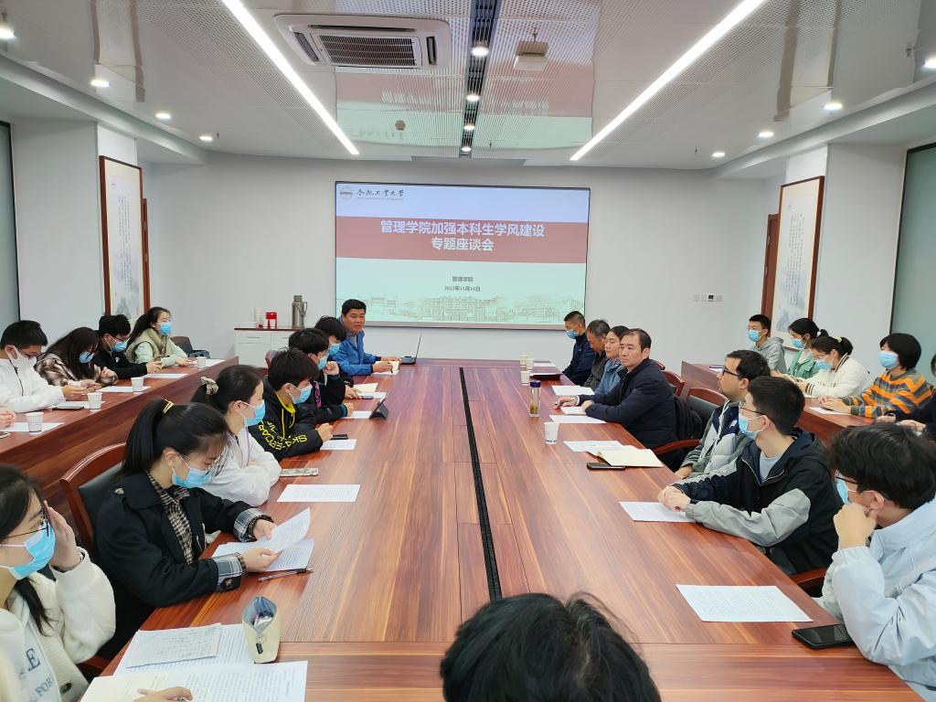 11月16日,管理安博(中国)在屯溪路校区管理安博(中国)新大楼325会议室召开加强本科生学风建设专题座谈会,管理安博(中国)负责同志,教学工作办公室、学生工作办公室相关老师及本科生各班级学习委员参加座谈会。