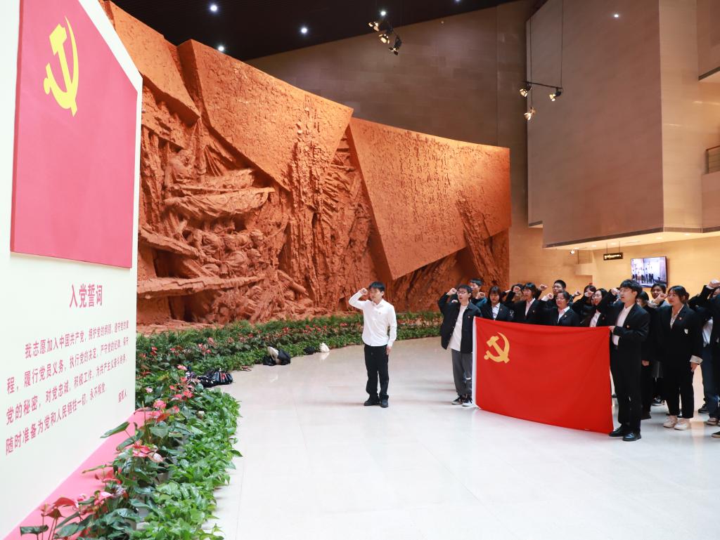战船曾载英烈志,高塔新展强国魂。仰望高塔、瞻仰战役总前委群雕后,学员们进入了渡江战役纪念馆进行参观学习。跟随着讲解员,大家依次参观了战前形势、战役准备、突破江防、战役胜利、人民支前和英烈业绩六个展区,聆听学习革命先烈的英雄事迹。最后,大家在纪念馆大厅进行了入党宣誓,全体成员举起右拳,誓词铿锵,信念坚定。