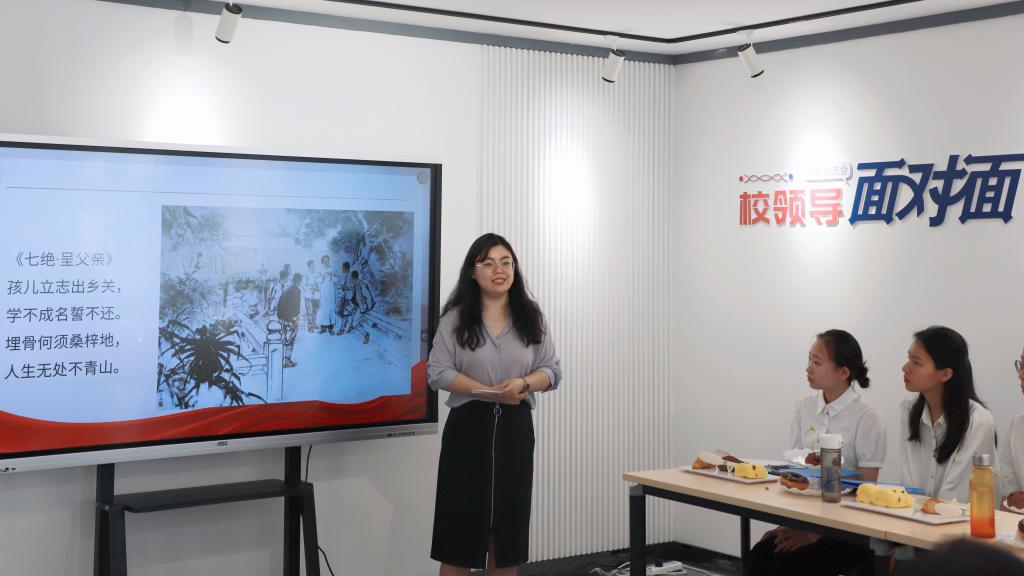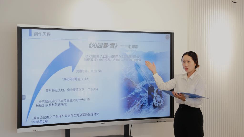 来自四个学生党支部的学员们分别带来了《忆秦娥·娄山关》《沁园春·雪》《七律·到韶山》和《沁园春·长沙》四首诗词的诵读和赏析。本科生第一党支部迟天泽结合《忆秦娥·娄山关》表示,树立远大志向需要有坚定的信念和理想,不畏艰难与挫折,勇于追求自己的目标,就像“雄关漫道真如铁,而今迈步从头越”表达的那样,需要拥有失败后重头再来的勇气。本科生第四党支部姬舒琪结合《沁园春·长沙》说,作为毕业班青年,应关注国家和社会的发展,把学习的具体目标同民族复兴的宏大目标结合起来,为构建更加繁荣和富强的中国贡献自己的力量。