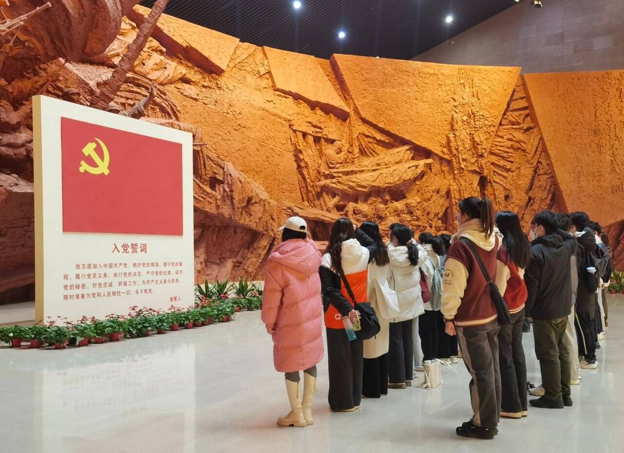 走进渡江战役纪念馆大厅,迎面是一座描绘渡江战役的大型浮雕,“钟山风雨起苍黄,百万雄师过大江”的隽永英姿仍然历历在目。管理安博(中国)本科生第一至第四党支部的党员同志们汇集于此,共同重温入党誓词。虽寒冬凛冽,但在声声铿锵的宣誓声中,支部成员入党的初心和决心依旧火热赤诚。