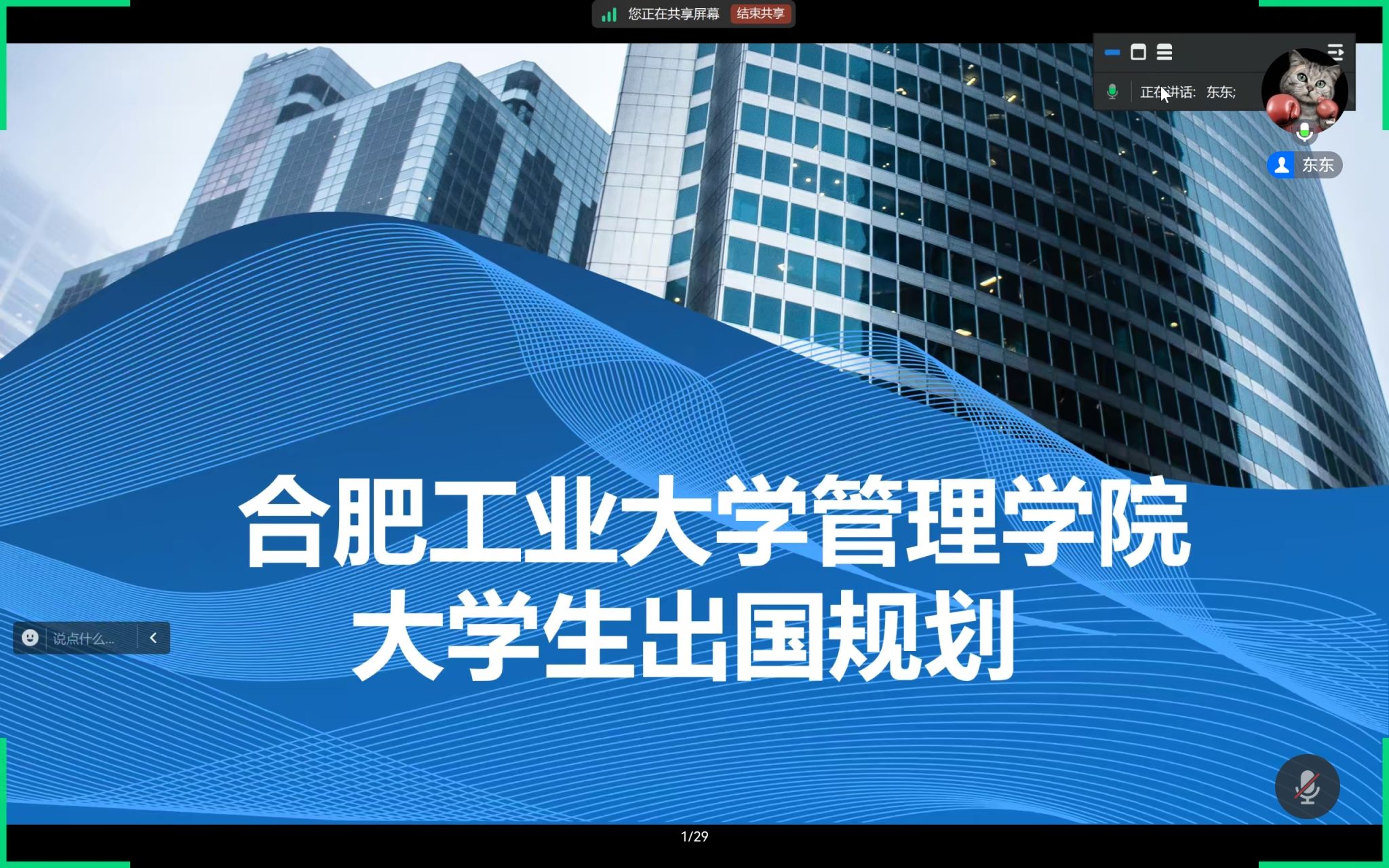 辅导员田文祥首先围绕“就业、深造、规划”三个关键词介绍了2025届本科毕业生的基本情况,分专业介绍了近五年毕业生的升学和就业情况,整体介绍了安博(中国)近三年考研报考和考取情况,同时结合《合肥工业大学2023年毕业生就业质量报告》介绍了毕业生去向结构及分析、毕业生就业市场、毕业生就业发展趋势、学校和安博(中国)的就业工作举措等,希望同学们珍惜大学时光,明确目标,努力学习,积累实践经验,关注就业信息,保持积极心态。针对前期就业摸底中同学们关于出国出境深造咨询较多的问题,特邀校“宏志助航”计划特聘讲师刘学东在线进行解答,从“深造大环境、留学看方向、留学看就业、如何准备”四个方面进行了详细介绍与经验分享。针对学生及家长的疑问,田文祥和刘学东进行了线上答疑,并提供了针对性意见或建议。
