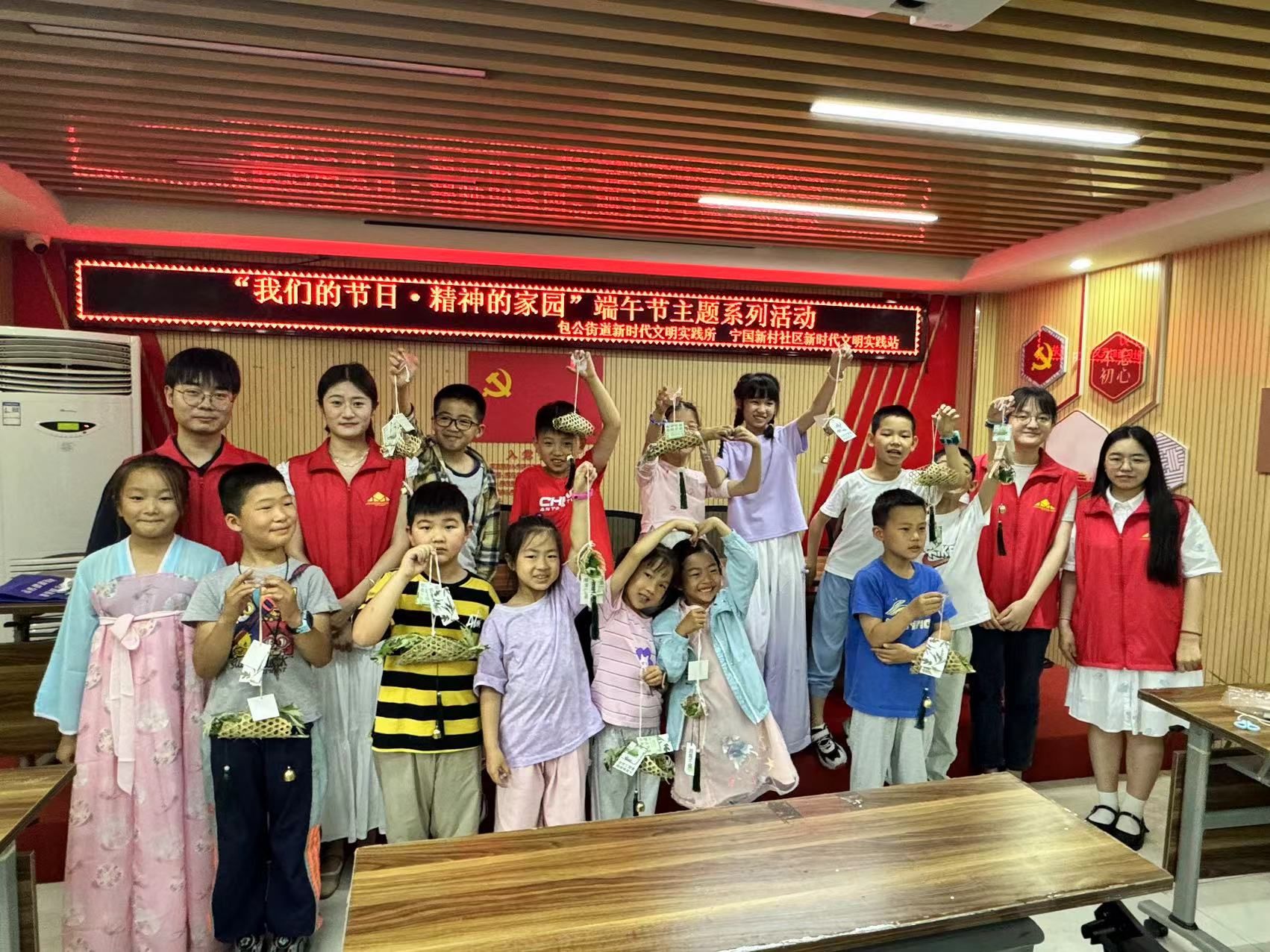 活动中,志愿者夏永正同学首先以PPT的形式分别介绍了端午节的起源;随后,介绍端午节的风俗,如划龙舟、吃粽子、画额、挂香包以及悬艾草,带领小朋友们充分了解我国端午节的传统习俗;接下来,志愿者与小朋友们一起学习端午节相关诗词,感受中华民族传统节日的独特魅力;最后进入游戏环节,首先以“语‘粽’心长”为主题的你画我猜小游戏,小朋友们积极参与。随后,志愿者们和小朋友们一起制作端午挂件,让孩子们从手工制作中获得快乐体验,从体验中感悟传统文化。活动结束后,研究生志愿者和小朋友们一同去社区周围给环卫工人等辛勤劳作的工作者送去了粽子,提前送去端午节祝福。
