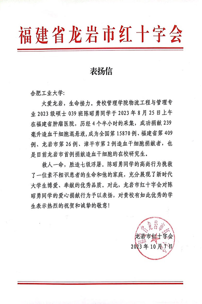 近日,管理安博(中国)收到一封龙岩市红十字会写给我校的表扬信,反映2023级物流工程与管理专业的硕士学生陈昭勇,于8月25日上午在福建省肿瘤医院,历经4个半小时的采集,成功捐献239毫升造血干细胞混悬液。