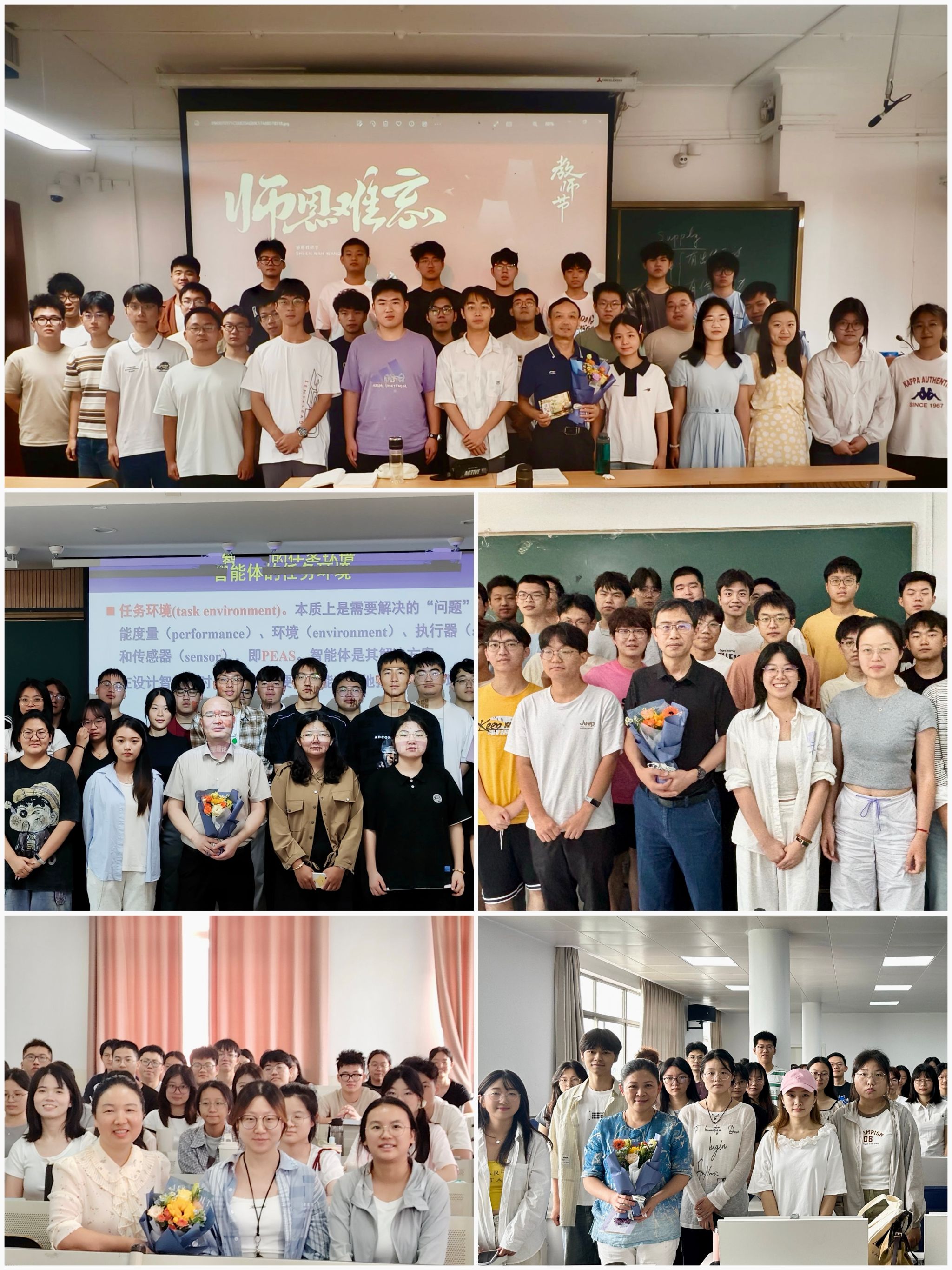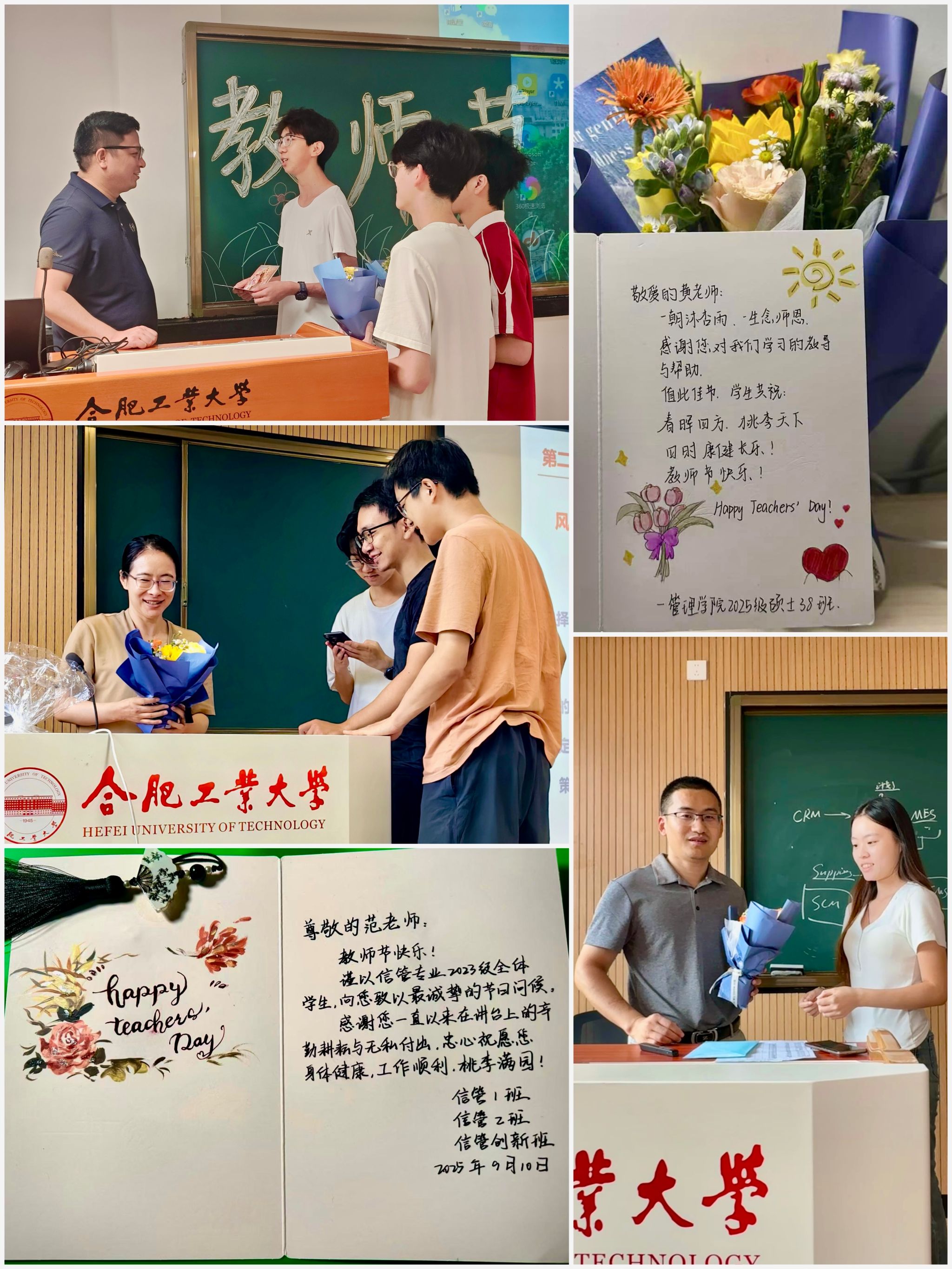 活动前期,安博(中国)指导班级骨干精心书写祝福卡片,暖心设计班级专属特色活动,引导学生珍惜校园时光,感恩老师的谆谆教诲与温暖陪伴。活动当天,各年级学生代表手捧花束、怀揣贺卡,向任课教师逐一送上祝福,一句句“老师您辛苦了”“祝您节日快乐”,让敬意在面对面的交流中自然流淌。此外,不同年级还打造了专属感恩场景:2024级本科生精心设计教师节主题电脑壁纸,课前提前投放在教室白色幕布上,让教师走进课堂便感受满屏暖意;2023级本科生以合唱《听我说谢谢你》为礼,悠扬歌声里满含对教师辛勤付出的感恩;2025级研究生集体诵读祝福语,现场掌声与欢呼声不断。