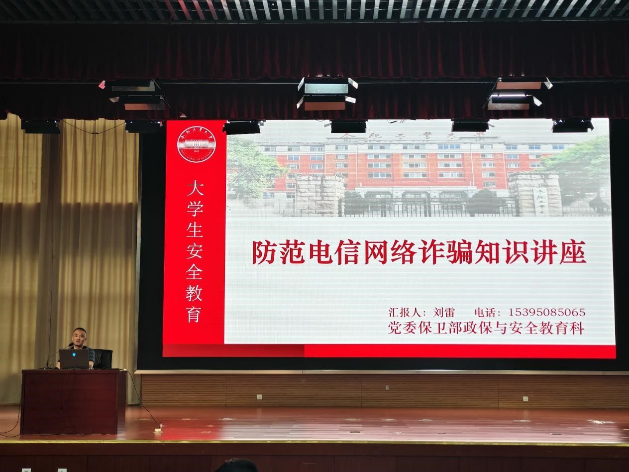 为进一步深化2025级本科生安全教育工作,增强安全宣传教育的针对性与实效性,帮助新生筑牢校园安全“防护网”,管理安博(中国)于9月20日在翡翠湖校区开展“防范电信网络诈骗知识讲座”,特邀党委保卫部政保与安全教育科刘雷老师担任主讲人,2025级本科生辅导员王昂、2025级全体本科生参与此次活动。