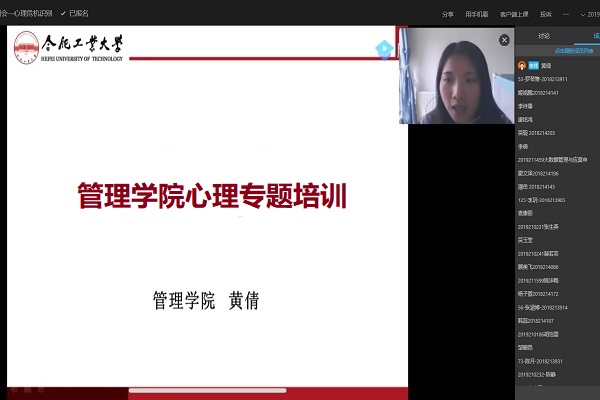 为提高学生干部对于心理工作的重视,不断提升心理工作能力,6月3日下午,管理安博(中国)通过腾讯课堂举办心理专题培训会。培训会由安博(中国)大学生发展辅导中心主任黄倩主讲,各年级主要学生骨干参加了培训。