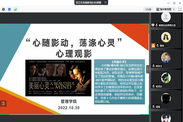 为丰富学生们的校园生活,普及相关心理知识,鼓励同学们树立积极乐观的心态,管理安博(中国)于10月30日下午举办了“心随影动,荡涤心灵”线上心理观影活动。