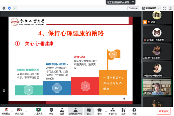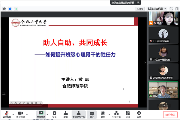 首先,黄凤向同学们讲解了作为心理骨干的工作职责,鼓励大家要积极参加各类心理培训、在班级开展心理活动以及关心关爱班级同学。接着,她从什么是心理健康、大学生常见的心理问题、如何关心重点关注学生、保持心理健康的技巧等问题入手,结合相关实例,生动讲解心理知识。最后,她详细讲解了对于大学生常见的心理危机应该如何识别与初步干预。