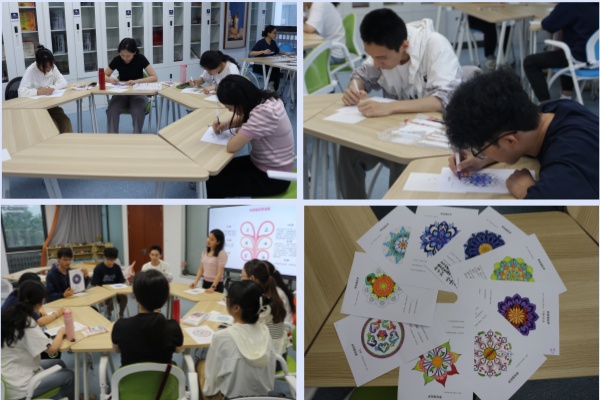 首先,黄倩向同学们介绍了绘画的内容、意义、效果和具体的流程,她告诉同学们,绘画作为一种简单而有效的心理调节方法,可以帮助同学们探索自我,表达内心。接着,黄倩带领同学们按照“静、思、想、画、写、析”的流程开展活动,带领同学们静心、沉思、遐想、彩绘、记录、分享。在绘画过程中,同学们学会集中注意力,专注当下、感受当下。最后,在分享展示阶段,同学们表示自己在活动中做到了关注当下、注重自我,专注于绘画和涂色,让自己的情绪达到了平静状态。