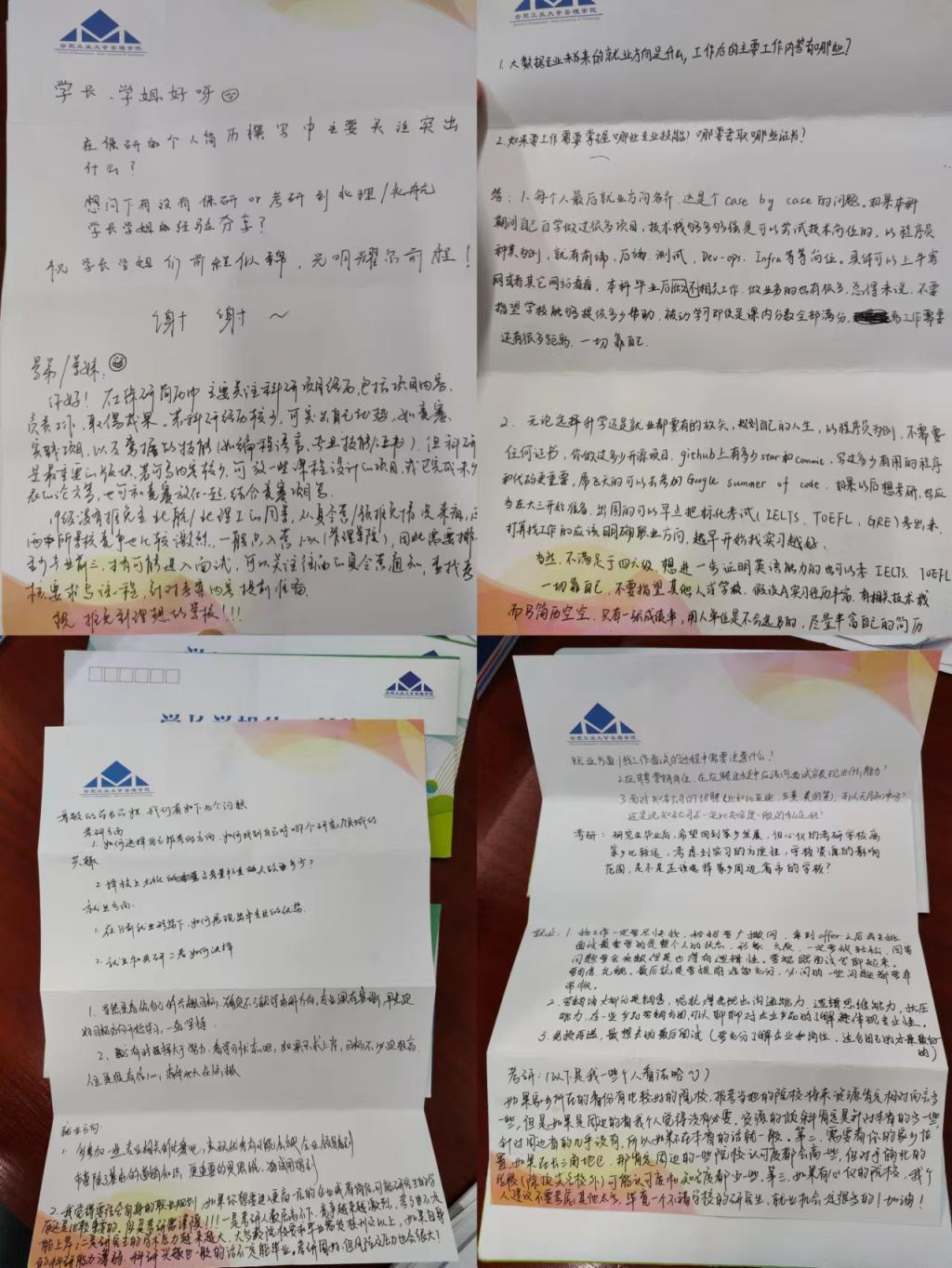 大三年级于五月以寝室为单位发放信纸,寝室成员匿名写下自己在就业、考研等方面的问题和困惑,由各班心理委员收齐后,再交给毕业班对应专业的优秀学生,由学长学姐在信中逐一解答后返还。本次活动共收到90余份回信,解答问题300多个,学生参与度较高。