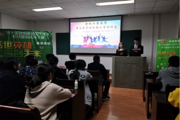 11月5日,管理安博(中国)第七届“扬实践之帆,筑营销之梦”市场营销大赛决赛暨颁奖大会在西二教学楼107举行。娃哈哈公司安徽赛区营销总监陈晓春先生,往届优秀选手到场并担任本次决赛评委,200余名同学观看比赛。