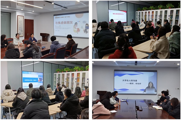 培训包含一场主题讲座和三场集中学习。主题讲座由安博(中国)大学生发展辅导中心主任黄倩主讲,她围绕主题“与焦虑做朋友”展开讲述,从认识焦虑和与焦虑共处两个方面进行讲解,引导同学们要正确认识焦虑、接纳焦虑。三场集中学习以线下集中学习网络课程的形式开展,分别是由中国科安博(中国)心理研究所沟通研究中心主任王文忠主讲的“如何更好地认识自己、塑造自己”,中国人民大学心理健康教育与咨询中心教授周莉主讲的“朋辈心理咨询的原则和方法”,北京科技大学心理素质教育中心副主任、副教授臧伟伟主讲的“大学生人际沟通——我好,你也好”,学习过程中同学们聚精会神、认真聆听。