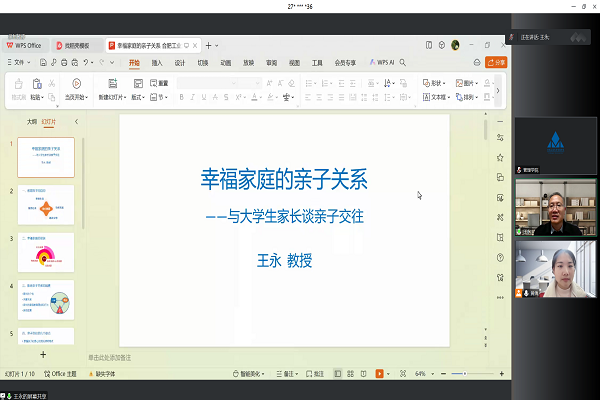 首先,王永教授针对教育孩子的目的、幸福家庭的资源、影响亲子关系的因素进行了讲解。接着,针对如何进行亲子交往,王永教授给出了几个要点,他提到作为家长要遵循规律、因材施教、经常鼓励、温暖陪伴、理解尊重、以身示范,呼吁家长要建设和谐、温暖、有力、稳定的家庭环境。最后,他提到如果发生亲子冲突时,家长不妨缓一缓、暖一暖、抱一抱,看见孩子的需求,尽可能多陪伴孩子。讲解过程中既有理论分析,又有案例讲解,整场讲座内容生动有趣。