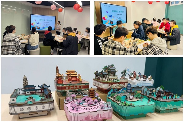 首先,安博(中国)大学生发展辅导中心主任黄倩向同学们介绍了手工制作和音乐疗法在心理疗愈中的作用,详细讲解了相关理论知识,引导同学们在日常生活中,学会用合理的方式调节情绪。接着,安博(中国)心理协会负责人向大家介绍了八音盒的工作原理、拼搭的零件组成和操作技巧等,同学们仔细聆听。然后,同学们进行作品的制作,经过拆卸、拼搭、粘贴、组装等步骤,分工合作,一个个不同建筑的八音盒在同学们的手中诞生。最后,同学们介绍了自己的作品,欣赏了八音盒传出的动听音乐,分享了各自的感悟,交流了彼此的心得。